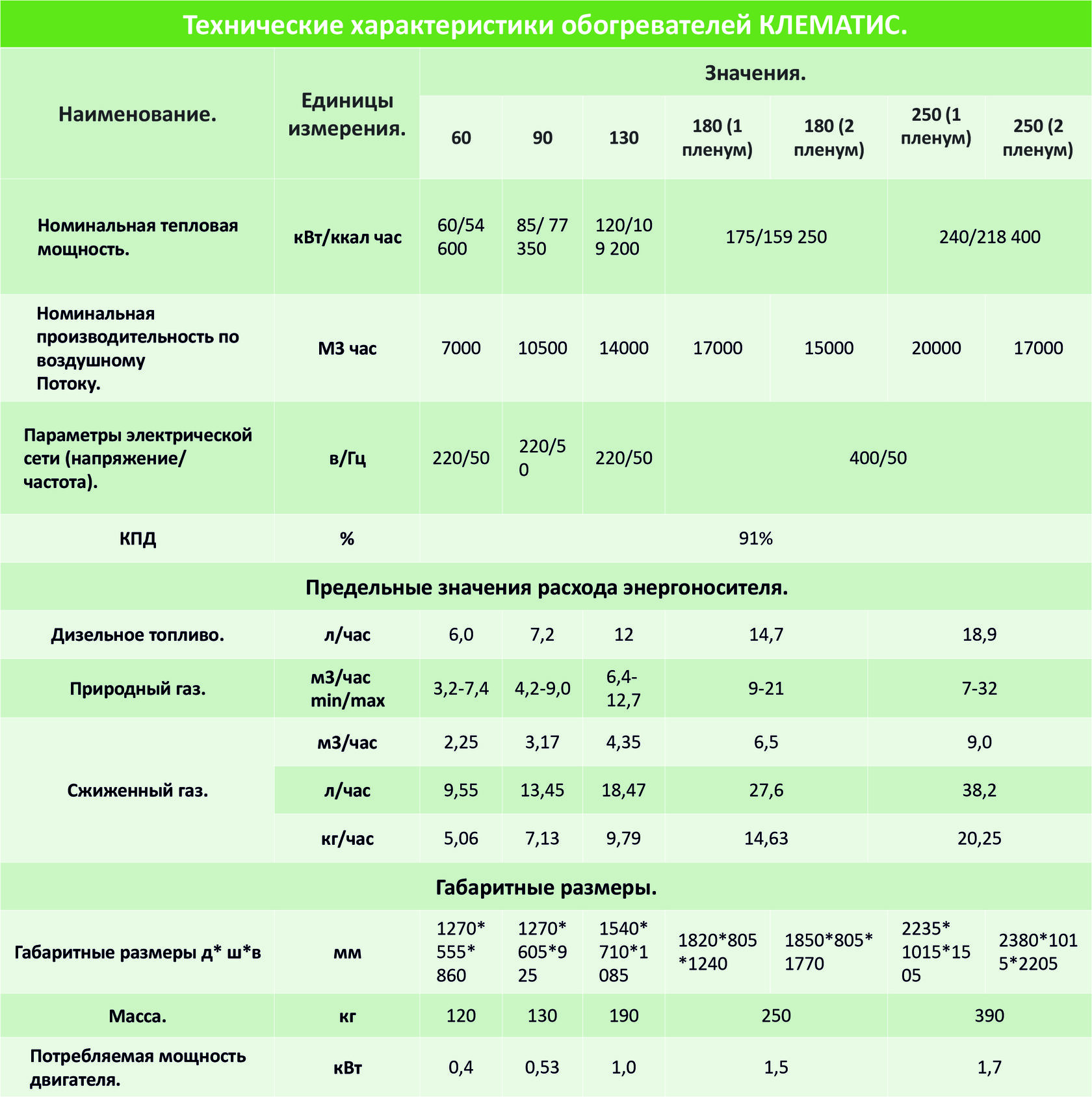 Выпускаются отопители мощностью от 60 до 250 кВт. Работают на природном и сжиженном газе, на дизельном топливе.