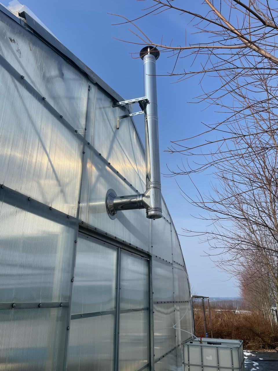 Котлы при необходимости комплектуются дымоходами, клапанами для вывода дымохода наружу (через пленку или СПК) комплектом для подвесного размещения.