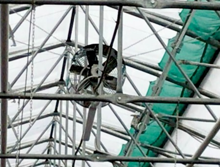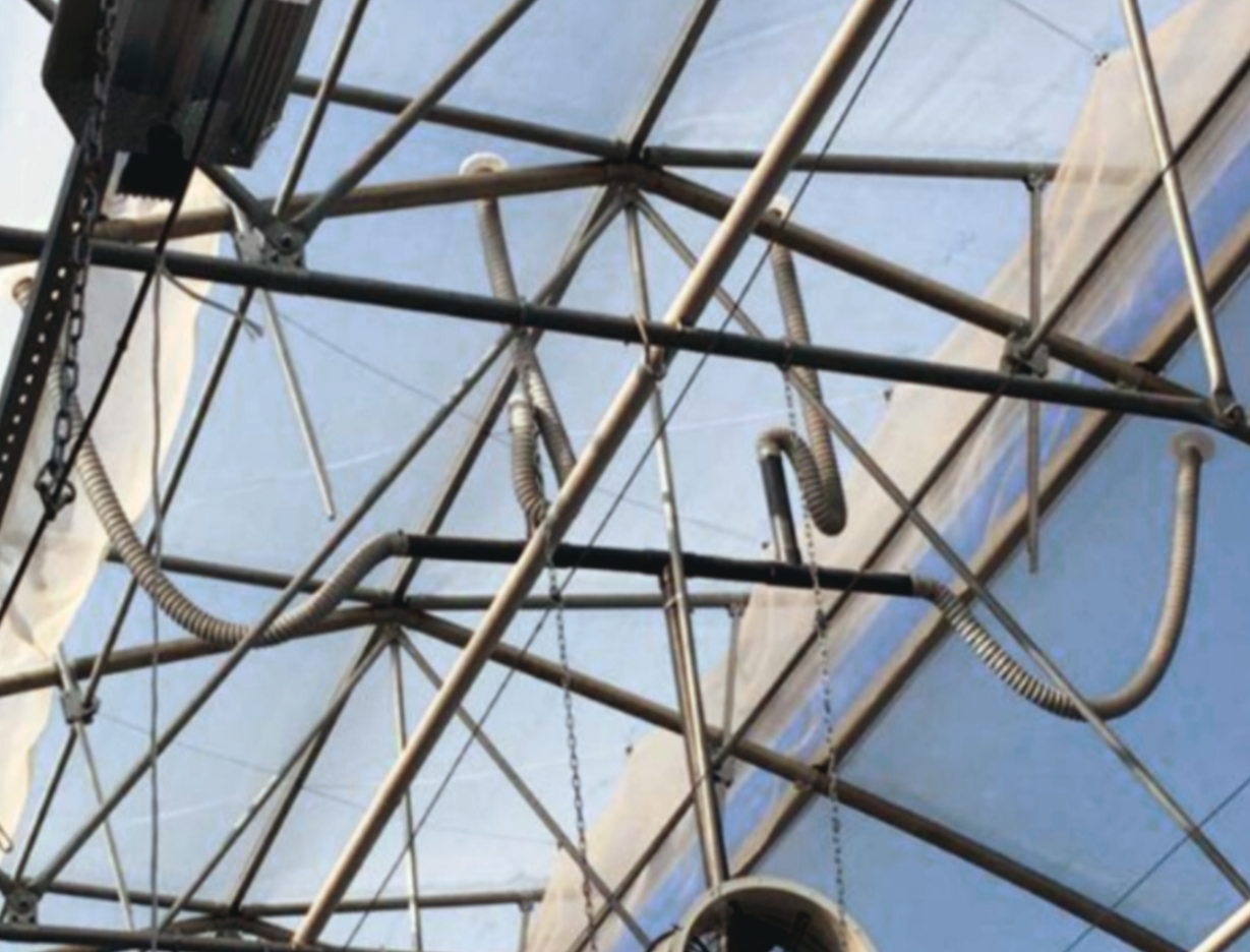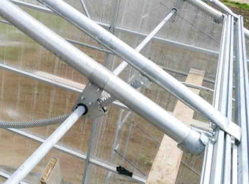 Кровельная форточка имеет длину по всей кровли теплицы и ширину 1.85 метра. Открытие производится с помощью мотор-редуктора мощностью 0.55 Kw, 380 V, крутящий момент 600 Nm. Управление происходит с электро-щита теплицы. Регулировка диапазона открытия -на корпусе электро-мотора. Форточка защищена москитной сеткой 40 mesh. Сетка крепится отдельно от пленки покрытия теплицы, это дает возможность замены отдельно, одного от другого.