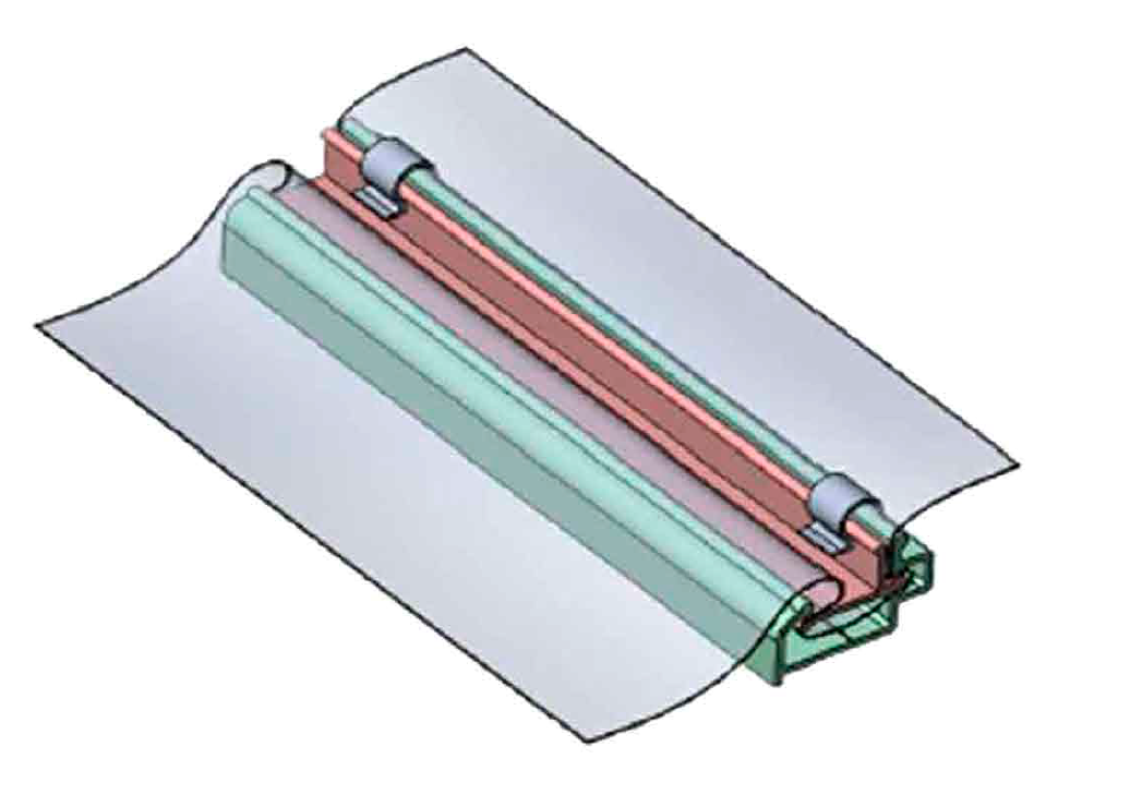 Боковая вентиляция, удерживается металлическими ограничителями шторы.Они крепятся к аркам с шагом пять метров. Не требуют демонтажа при замене москитной сетки. В ограничителе предусмотрен паз для фиксации вала и натяжки шторы в развернутом состоянии. Москитная сетка находится под шторой.