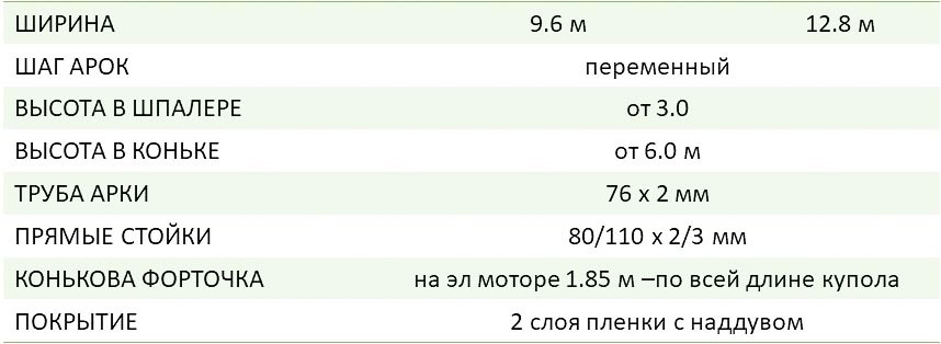 Конструктив каркаса многорядной промышленной теплицы имеет значительные запасы по прочности. Промышленная теплица подразумевает нагрузки от купольного, подлоткового, вертикальных контуров отопления. Возможной установки автоматизированных рам полива, системы досветки, кабель-каналов и др инженерных систем.