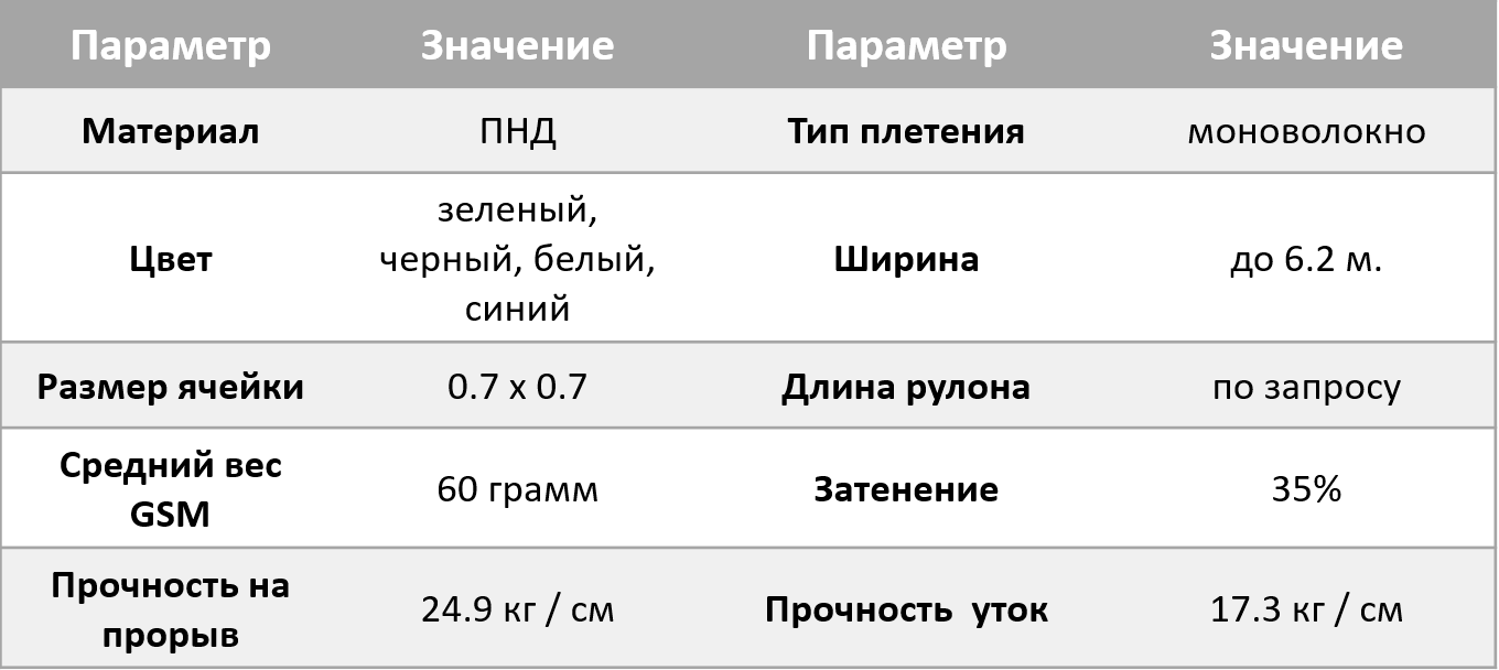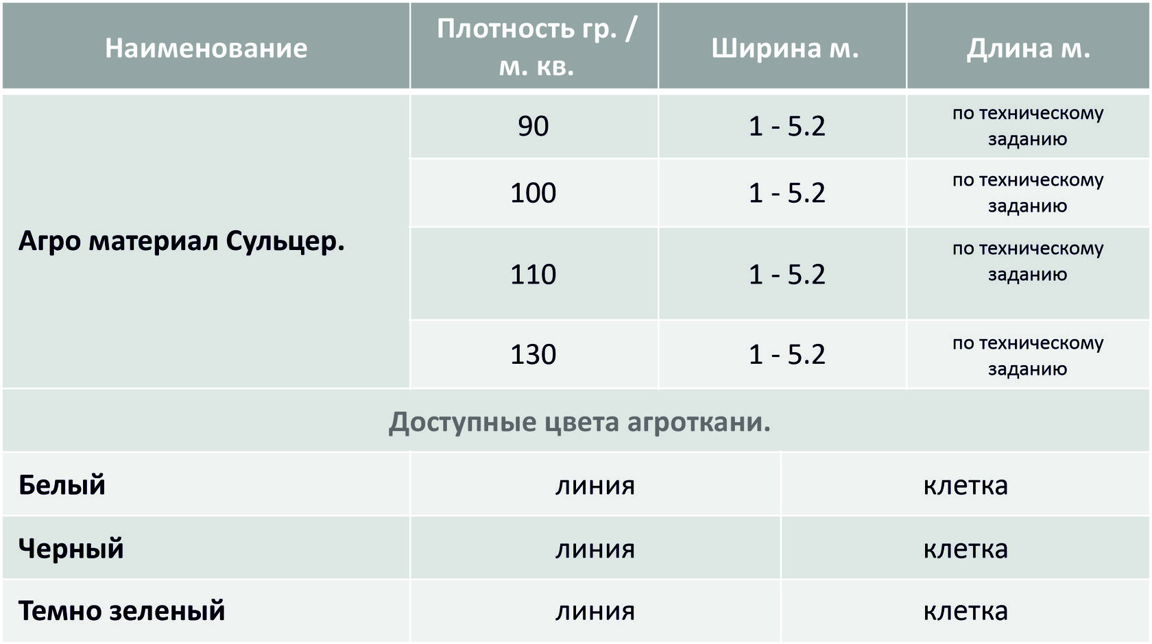 Агроткань Сульцер имеет несколько базовых цветов: черный, темно-зеленый, белый, есть разметка в клетку. Изготавливается из 100% первичного полипропилена, имеет защиту от UV-излучения. Срок службы – 5 лет.