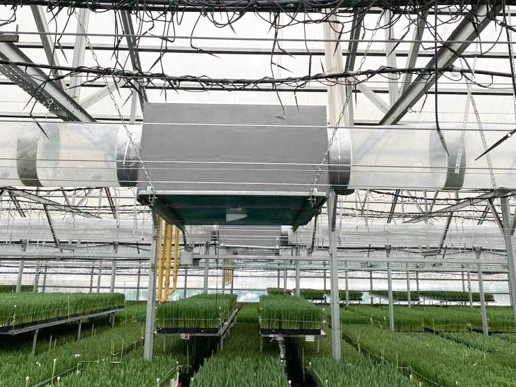 В зависимости от особенности подвода магистрали и задачи в размещении, может быть применен двухпленумный газовый отопитель, с выходом горячего воздуха в две стороны. Нагретый воздух распределяется по пространству туннельной теплицы по рукаву. Перфорацию рукава имеет смысл делать, непосредственно, после установки газового котла, чтобы оптимально распределить горячие потоки, и влиять на циркуляцию воздуха в теплице.